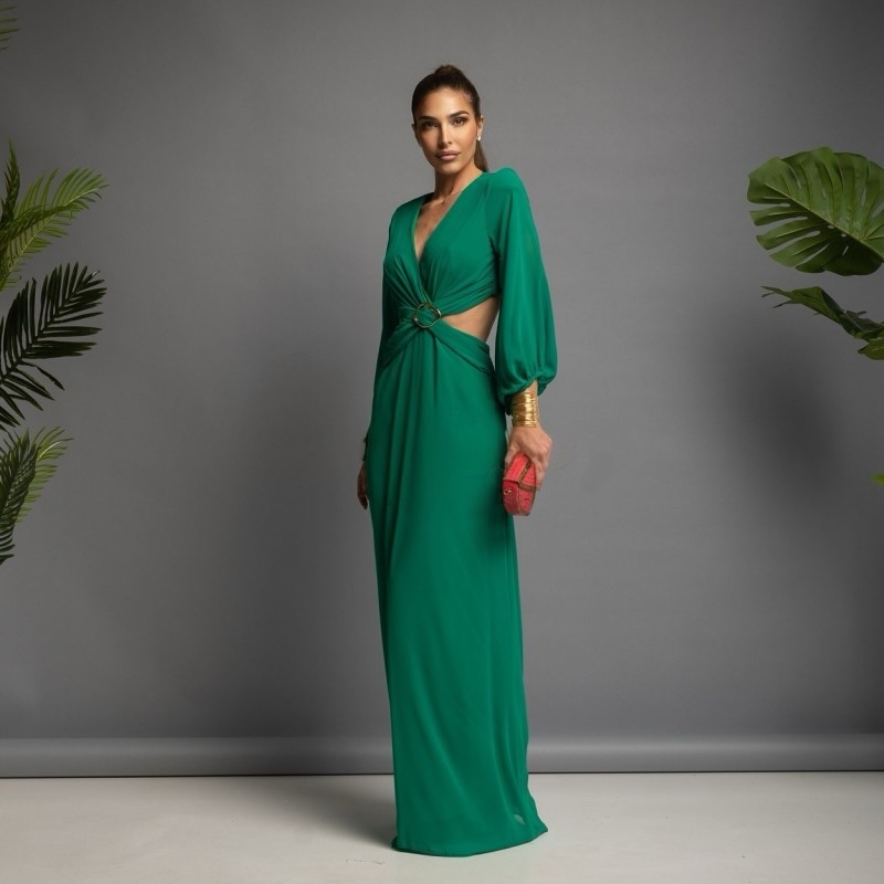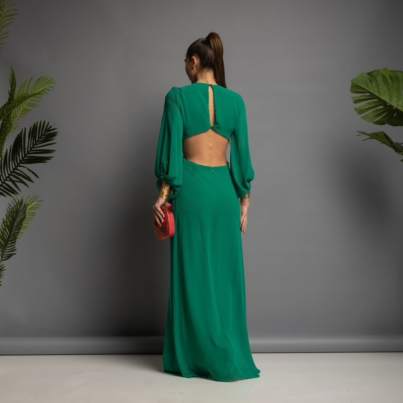 Turn heads in this stunning emerald green maxi dress featuring a deep V-neck, dramatic balloon sleeves, and elegant cut-out details. The open-back design adds a touch of allure, making it the perfect choice for special occasions. Shop now for effortless glamour!